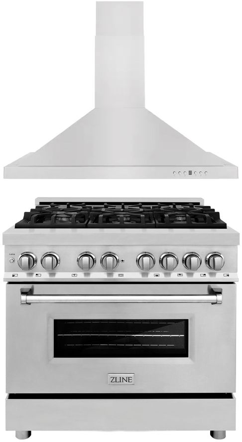 ZLINE 2 Piece Stainless Steel Kitchen Package with freestanding dual fuel range and wall mounted range hoodRead More